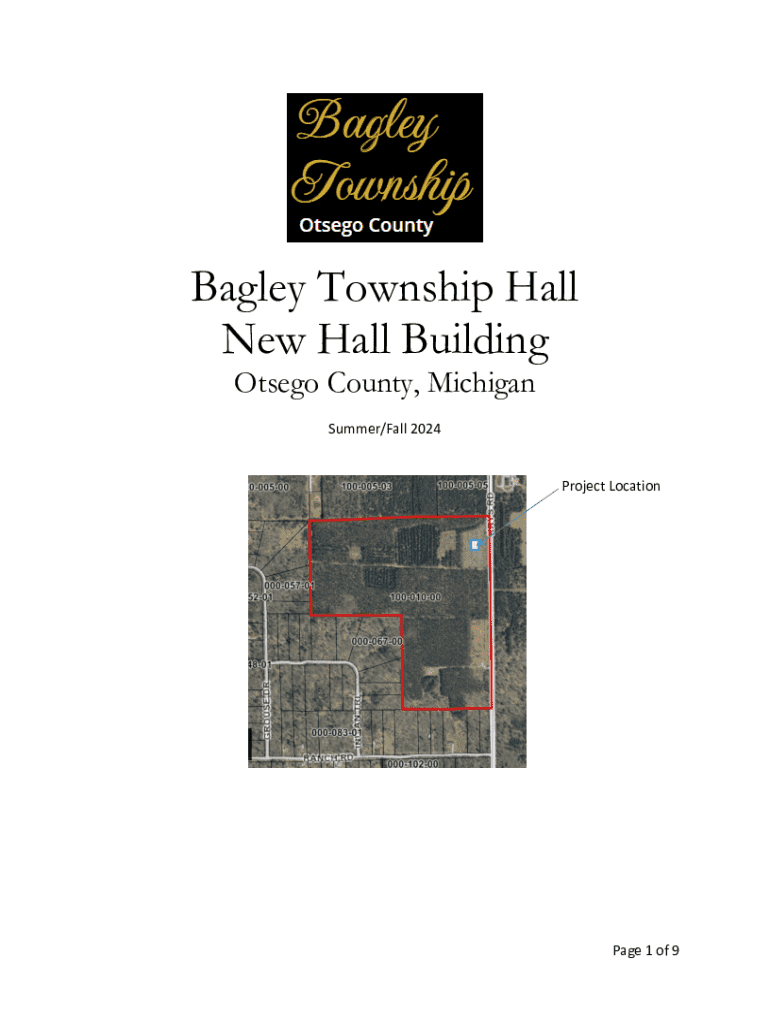 This document outlines the instructions and bidding requirements for the construction of a new single-story wood-framed Bagley Township Hall located at Krys Road, Gaylord, Michigan. It includes details on project specifications, timelines for bid submissions, contact information for inquiries, and guidance on the proposal process.
