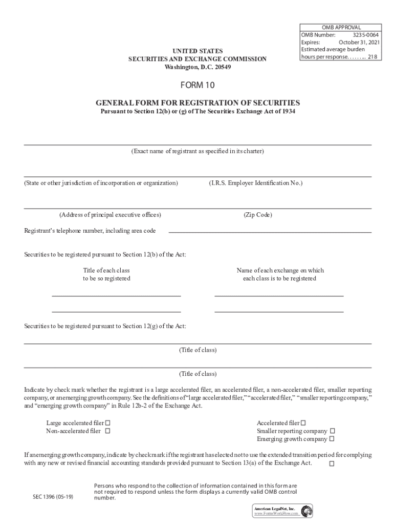 This document is a registration statement used by public companies to register their securities pursuant to the Securities Exchange Act of 1934. It includes various items such as business information, risk factors, financial information, properties, security ownership, executive compensation, and legal proceedings, as well as general instructions for compliance.