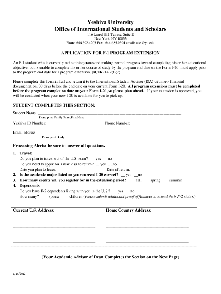 This application form is for F-1 students at Yeshiva University who are seeking to extend their program of study due to circumstances preventing them from completing their academic objectives by the expiration date on their Form I-20.
