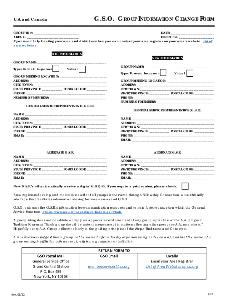 G.S.O. GROUP INFORMATION CHANGE FORMU.S. and CanadaGROUP ID #: ___ DATE: ___ AREA #: ___ DISTRICT #: ___ If you need help locating your area and district number, you can contact your area registrar