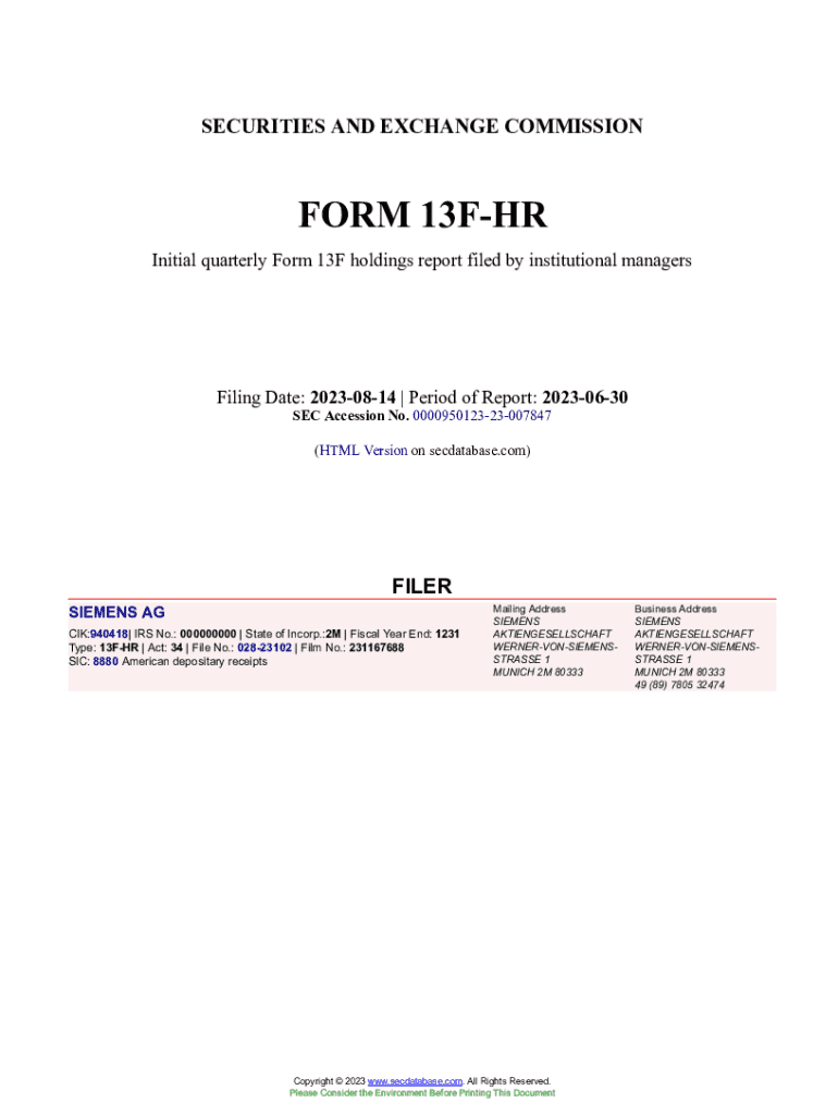 This document is an initial quarterly holdings report filed by Siemens AG under Form 13F, detailing their investment holdings as of June 30, 2023. It outlines institutional investment manager activities and includes basic information about the filing entity, signatures, and a summary of the holdings reported.