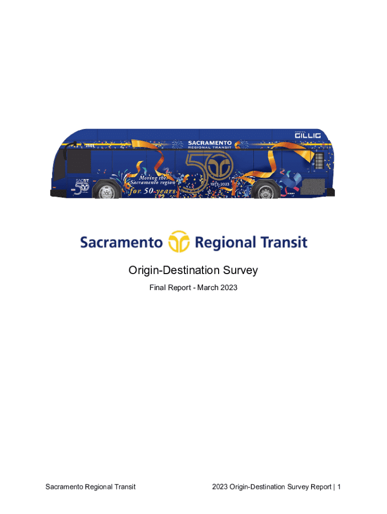 This report presents the findings of the 2023 Origin-Destination Survey conducted by the Sacramento Regional Transit District, documenting travel patterns and demographic information of bus and light rail riders in Sacramento County. The report highlights key aspects such as trip purposes, fare payment methods, demographics, and transfer rates among different transit services, with an objective to improve transit services and comply with federal regulations.