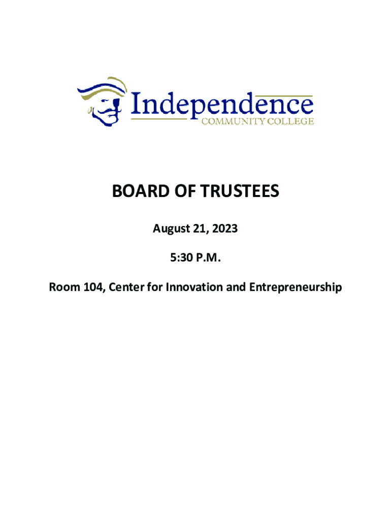 BOARD OF TRUSTEES August 21, 2023 5:30 P.M. Room 104, Center for Innovation and EntrepreneurshipIndependence Community College 1057 W. College Ave. Independence, KS 67301 www.indycc.edu Office of