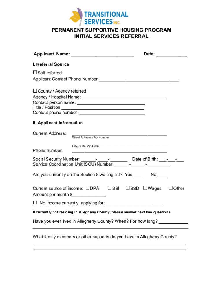 PERMANENT SUPPORTIVE HOUSING PROGRAM INITIAL SERVICES REFERRAL Applicant Name: ___Date: ___I. Referral SourceSelf referred Applicant Contact Phone Number ___County / Agency referred Agency / Hospital
