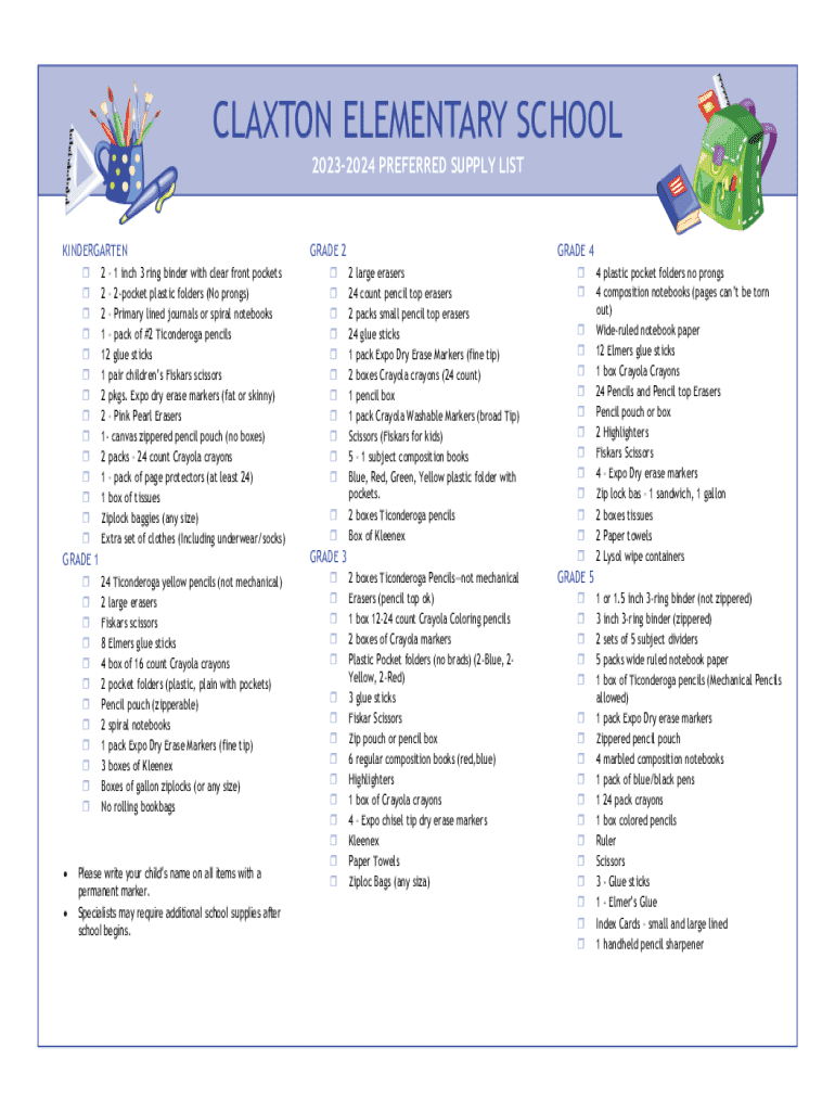 CLAXTON ELEMENTARY SCHOOL 20232024 PREFERRED SUPPLY LISTKINDERGARTEN 2 1 inch 3 ring binder with clear front pockets 2 2pocket plastic folders (No prongs) 2 Primary lined journals or spiral notebooks