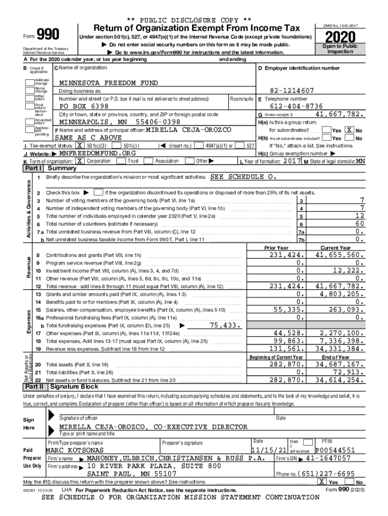 This document is the Form 990 for the Minnesota Freedom Fund, which details the organization\'s financial information, activities, and governance structure for the tax year 2020. It highlights the organization\'s mission to pay criminal bail and immigration bonds for individuals who cannot afford them and aims to eliminate discriminatory and oppressive jailing practices.