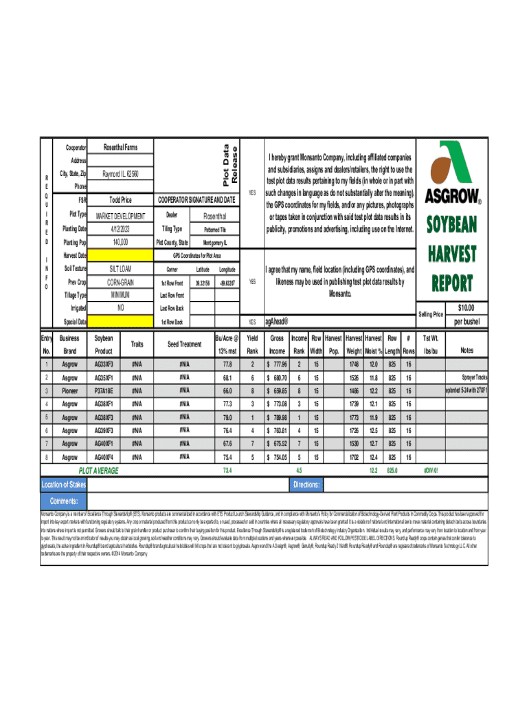 This document includes detailed plot data for Rosenthal Farms, including information about cooperator details, planting date, planting population, soil texture, GPS coordinates, crop history, and harvest reports. It outlines the agreements for data usage by Monsanto Company and compliance with stewardship guidelines for biotechnology-derived plant products.