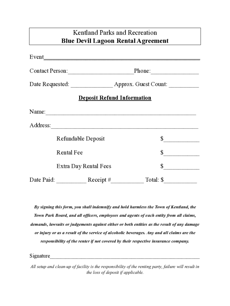 Kentland Parks and Recreation Blue Devil Lagoon Rental Agreement Event___ Contact Person:___Phone:___ Date Requested: ___ Approx. Guest Count: ___ Deposit Refund Information Name:___ Address:___ Refundable