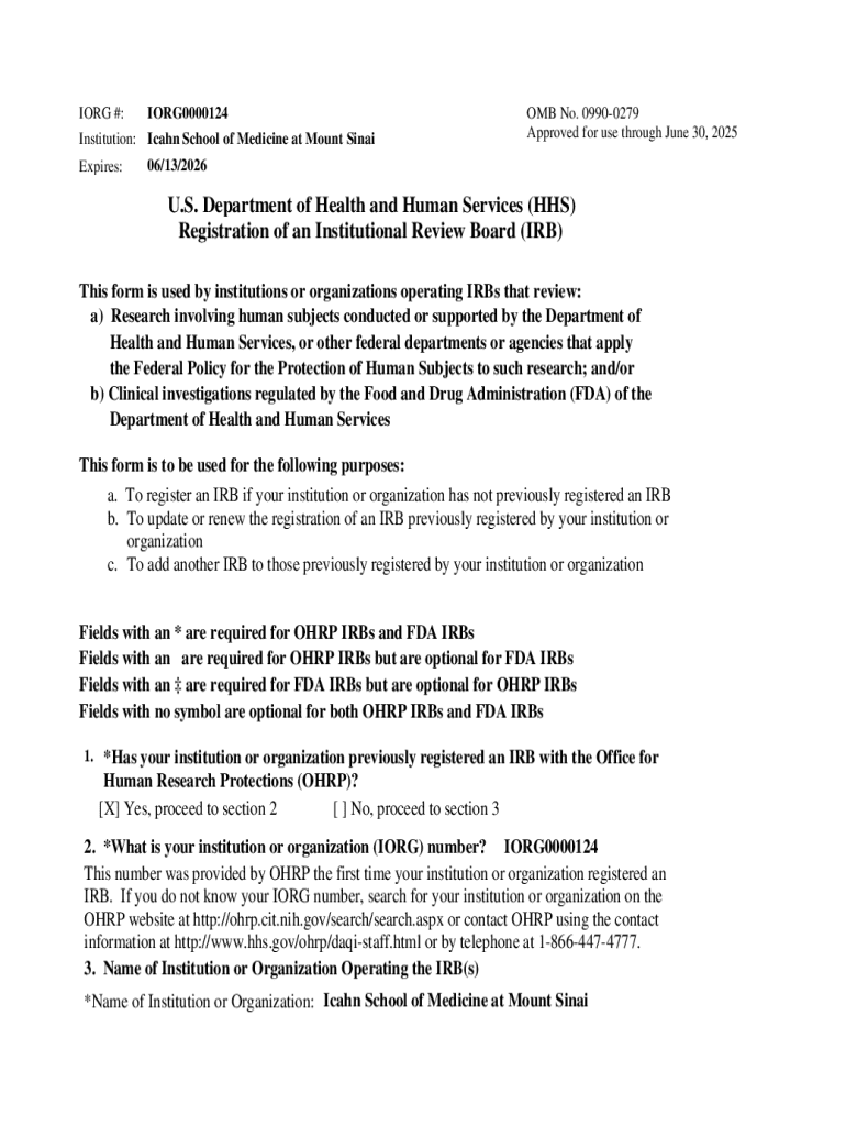 IORG0000124 IORG #: Institution: Icahn School of Medicine at Mount Sinai Expires:OMB No. 09900279 Approved for use through June 30, 202506/13/2026U.S. Department of Health and Human Services (HHS)