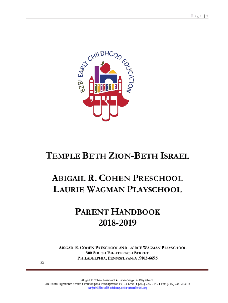 This parent handbook provides essential information regarding the philosophy, curriculum, policies, and expectations of the Abigail R. Cohen Preschool and Laurie Wagman Playschool for the 2018-2019 academic year. It highlights the school\'s commitment to fostering a joyful Jewish environment, promoting children\'s independence and creativity, and ensuring a collaborative relationship between educators and families.