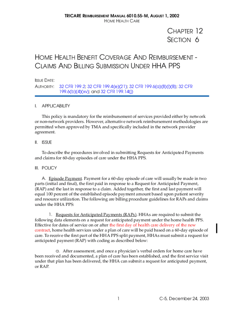 TRICARE REIMBURSEMENT MANUAL 6010.55M, AUGUST 1, 2002 HOME HEALTH CARECHAPTER 12 SECTION 6 HOME HEALTH BENEFIT COVERAGE AND REIMBURSEMENT CLAIMS AND BILLING SUBMISSION UNDER HHA PPS ISSUE DATE: AUTHORITY:I.32