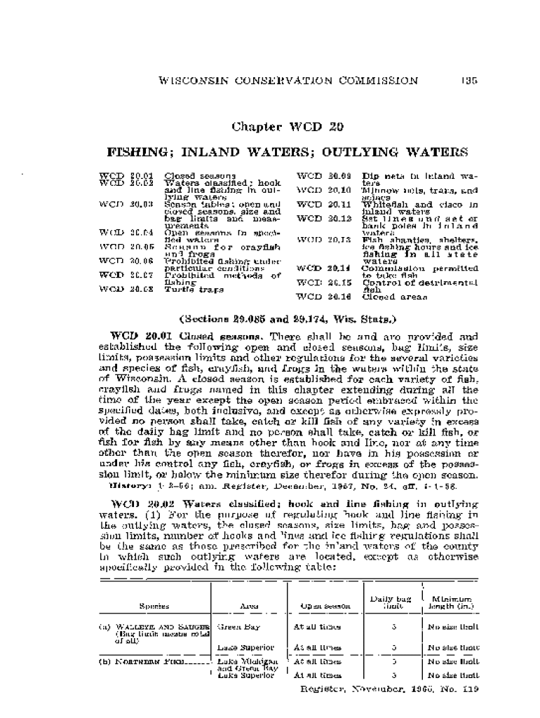 This document outlines the fishing regulations for inland and outlying waters in Wisconsin, including open and closed seasons, bag limits, size limits, methods of fishing, and rules specific to certain species and areas.