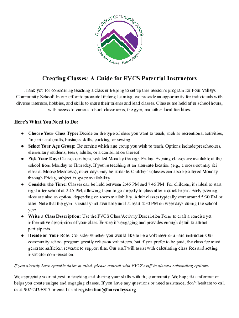 Creating Classes: A Guide for FVCS Potential Instructors Thank you for considering teaching a class or helping to set up this sessions program for Four Valleys Community School! In our effort to promote