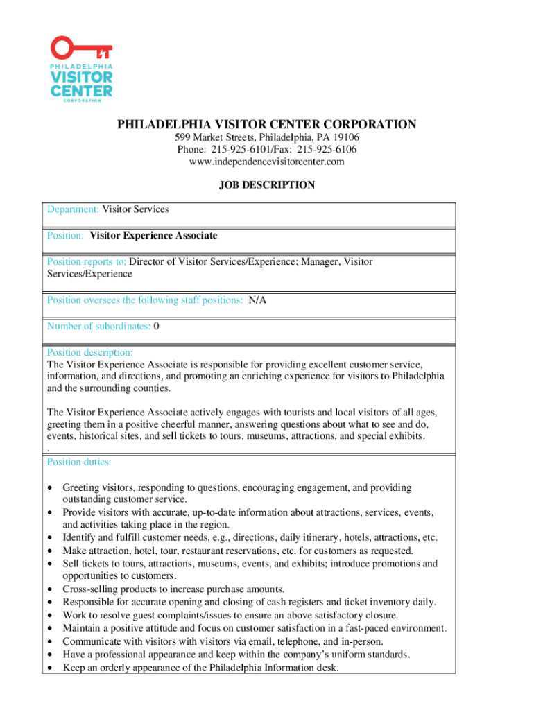 This document outlines the responsibilities, requirements, and duties of the Visitor Experience Associate position at the Philadelphia Visitor Center Corporation. It includes details about customer service expectations, sales responsibilities, and the skills necessary for the role related to visitor engagement.