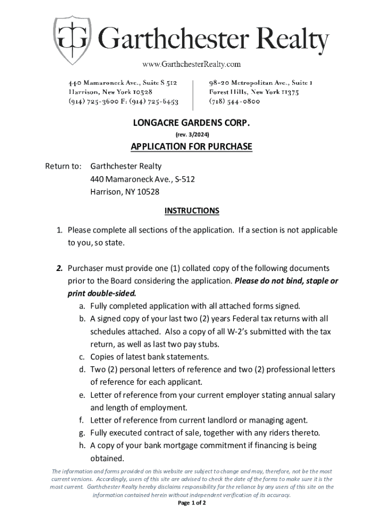 This document is an application for purchasing shares in the Longacre Gardens Corp. It includes detailed instructions on the required documentation, fees, cooperative housing regulations, and fair housing laws. The application requires personal and financial information and mandates additional fees for credit checks and the application process. It outlines the rights of the Board and the requirements for approval or denial of the application.