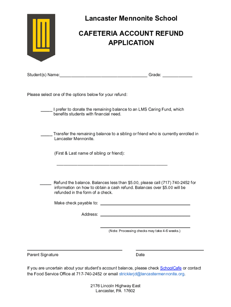 Lancaster Mennonite School CAFETERIA ACCOUNT REFUND APPLICATIONStudent(s) Name:___ Grade: ___Please select one of the options below for your refund: ___ I prefer to donate the remaining balance to