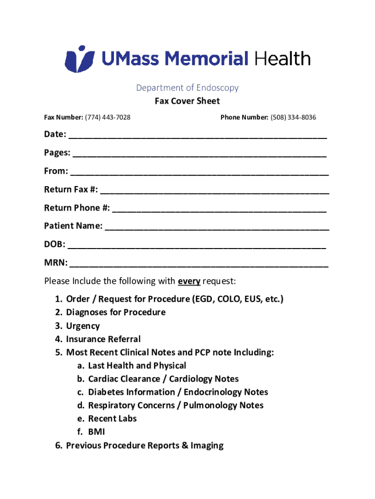 Department of Endoscopy Fax Cover Sheet Fax Number: (774) 4437028Phone Number: (508) 3348036Date: ___ Pages: ___ From: ___ Return Fax #: ___ Return Phone #: ___ Patient Name: ___ DOB: ___ MRN: ___