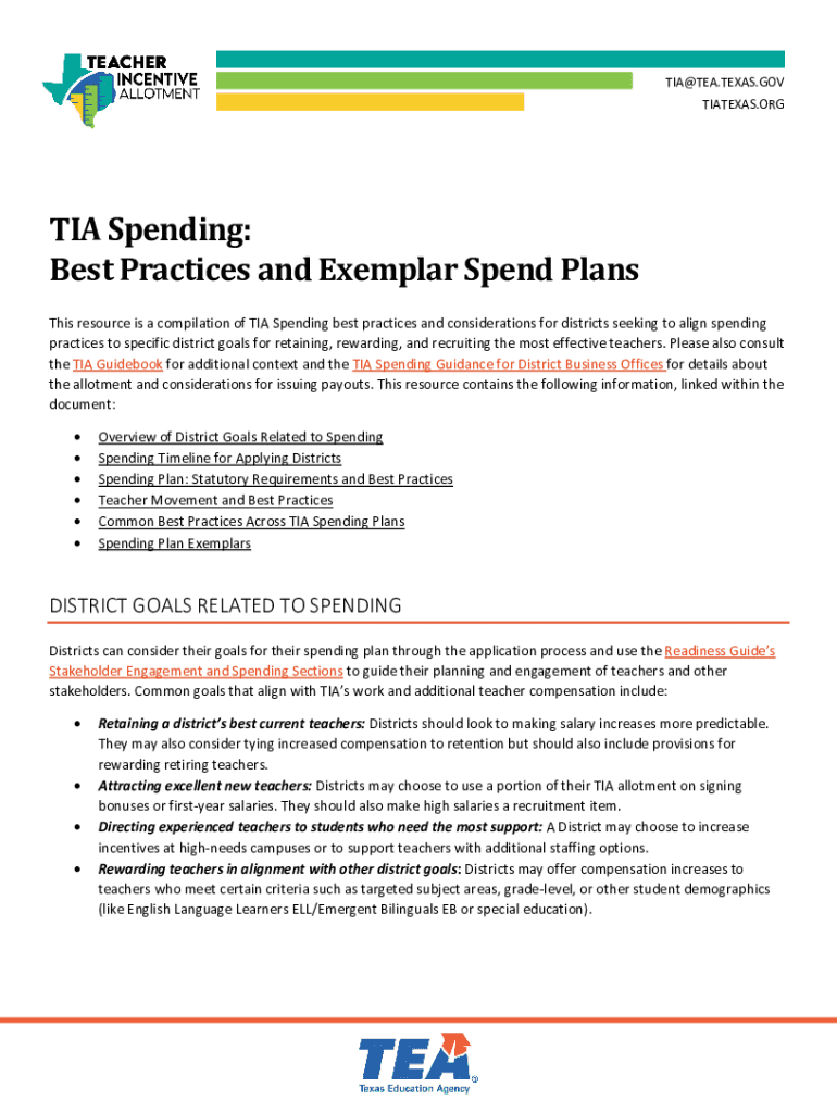 TIA@TEA.TEXAS.GOV TIATEXAS.ORGTIA Spending: Best Practices and Exemplar Spend Plans This resource is a compilation of TIA Spending best practices and considerations for districts seeking to align