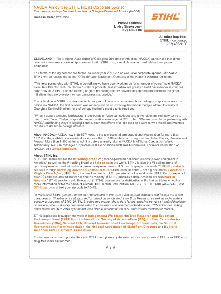 NACDA Announces STIHL Inc. as Corporate Sponsor Press release courtesy of National Association of Collegiate Directors of Athletics (NACDA)Release Date: 12/20/2016Press inquiries: Lindsy Shrewsberry