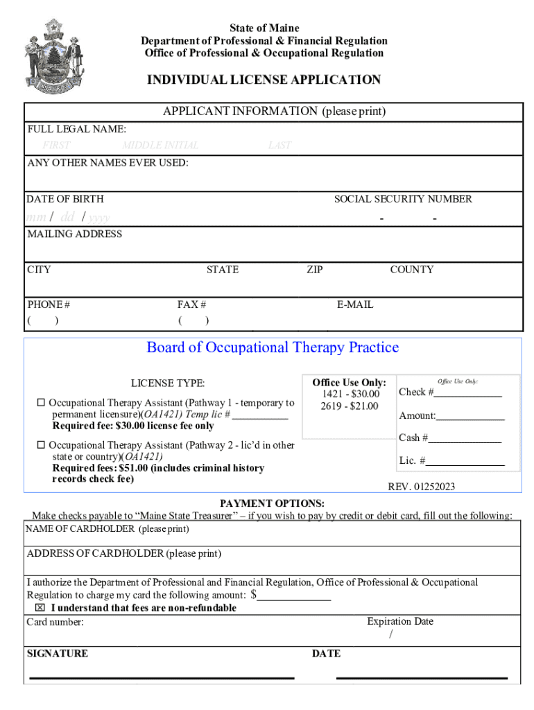 State of Maine Department of Professional & Financial Regulation Office of Professional & Occupational RegulationINDIVIDUAL LICENSE APPLICATION APPLICANT INFORMATION (please print) FULL LEGAL NAME: