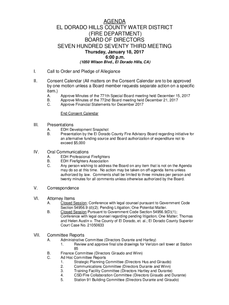 This document outlines the agenda for the 773rd meeting of the El Dorado Hills County Water District Fire Department Board of Directors, covering various topics such as consent calendar items, presentations, legal matters, committee reports, and financial statements.