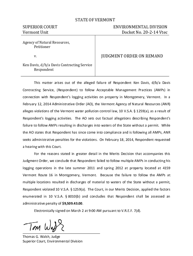 SUPERIOR COURT Vermont UnitSTATE OF VERMONTAgency of Natural Resources, Petitioner v.Ken Davis, d/b/a Davis Contracting Service RespondentENVIRONMENTAL DIVISION Docket No. 20214 VtecJUDGMENT ORDER