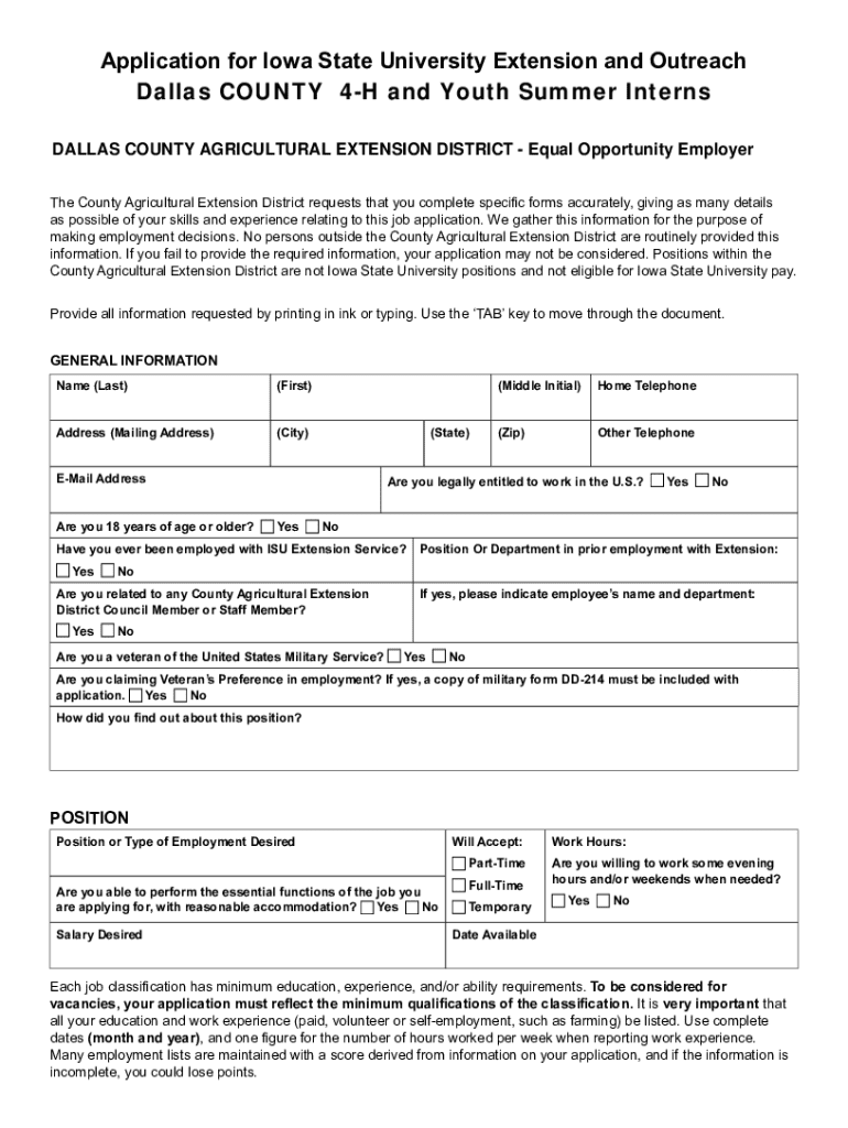 This application form is for individuals applying for summer internship positions with the Dallas County Agricultural Extension District. It collects personal information, work experience, education background, and skills to assess candidates\' qualifications for employment.