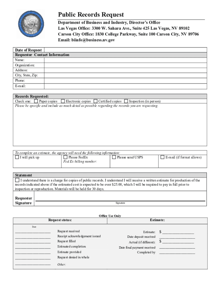 This document serves as a request form for obtaining public records from the Department of Business and Industry. It includes sections for requester contact information, details about the records requested, and acknowledgment of potential charges for copies.