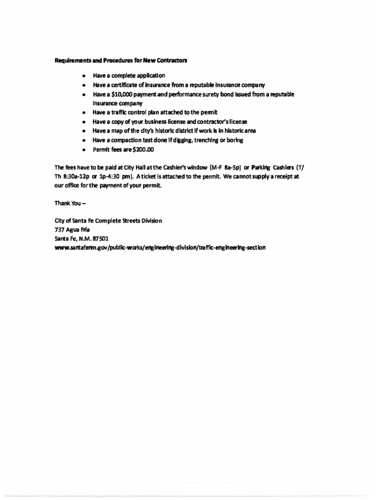 This document outlines the requirements and procedures for new contractors applying for street cut and restoration permits in the City of Santa Fe. It includes necessary documentation such as insurance certificates, surety bonds, traffic control plans, and permits fees. It also details obligations related to excavation work, restoration criteria, and compliance with city ordinances.
