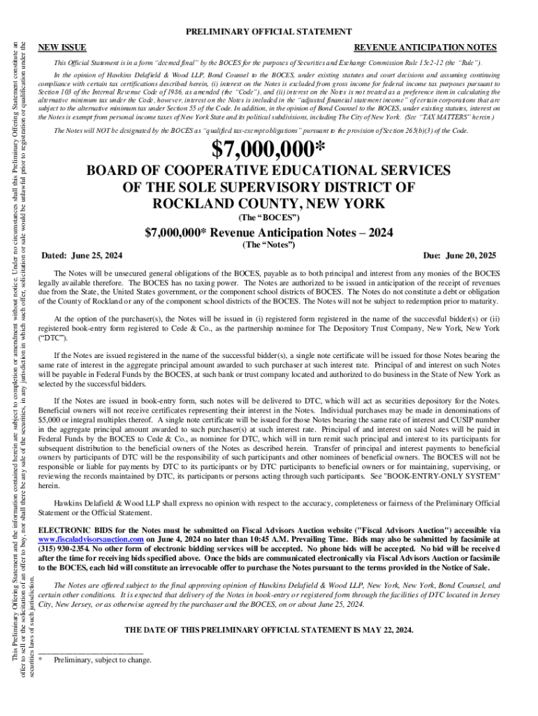 This Preliminary Offering Statement outlines the BOCES\' intent to issue $7,000,000 in Revenue Anticipation Notes due June 20, 2025. It discusses the nature of the notes, tax matters, payment processes, and the financial data related to the BOCES operations, emphasizing the need for funds in anticipation of state and federal revenues.