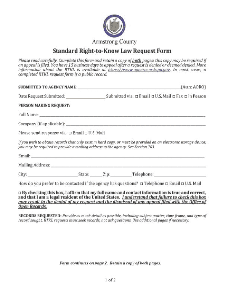 Armstrong CountyStandard RighttoKnow Law Request Form Please read carefully. Complete this form and retain a copyofbillJJ.pages; this copy may be required 1j an appeal is filed. You have 1S business