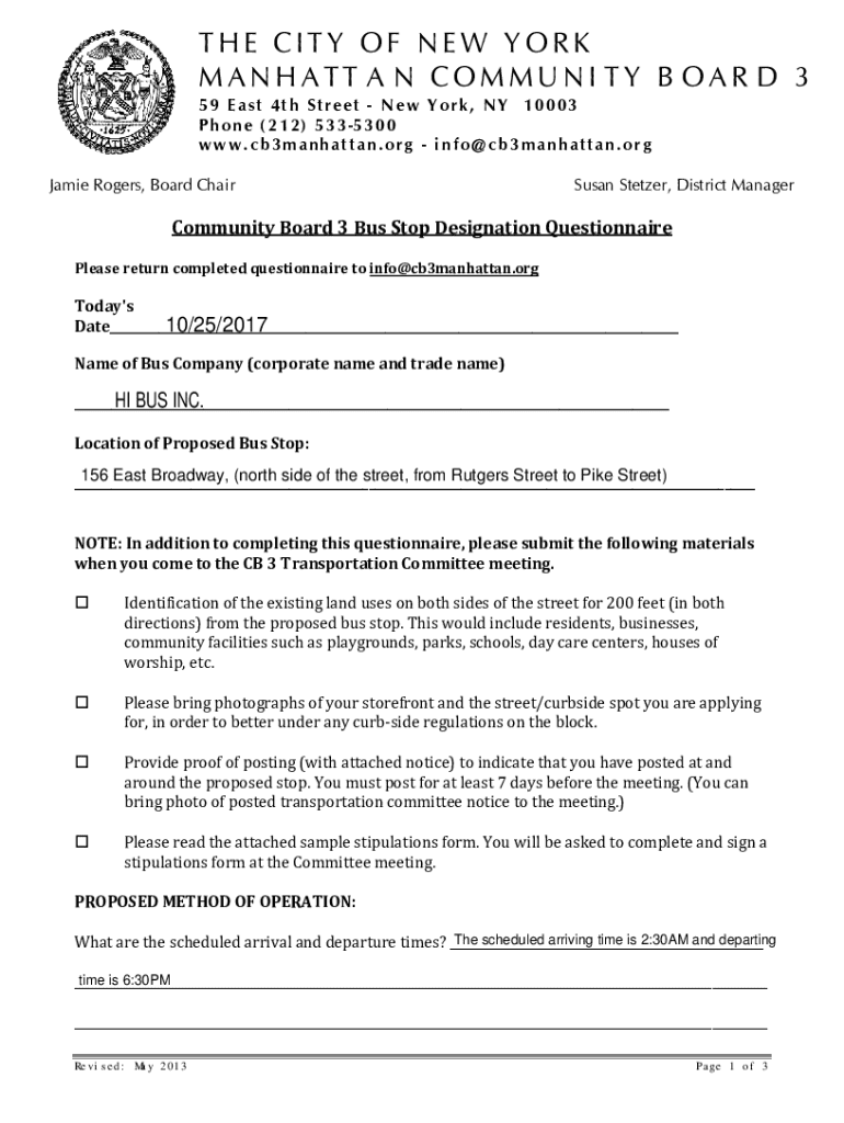 Get the free Community Board 3 Bus Stop Designation Questionnaire