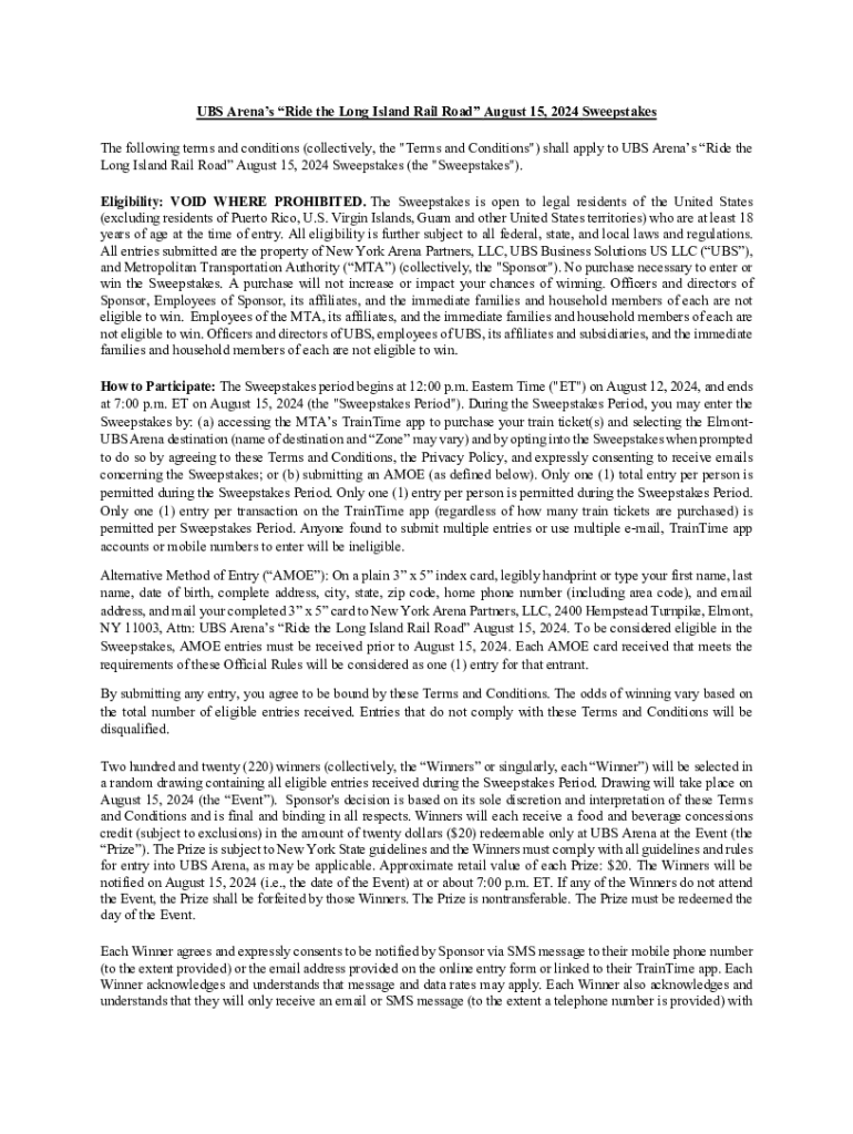 UBS Arenas Ride the Long Island Rail Road August 15, 2024 Sweepstakes The following terms and conditions (collectively, the \"Terms and Conditions\") shall apply to UBS Arenas Ride the Long Island