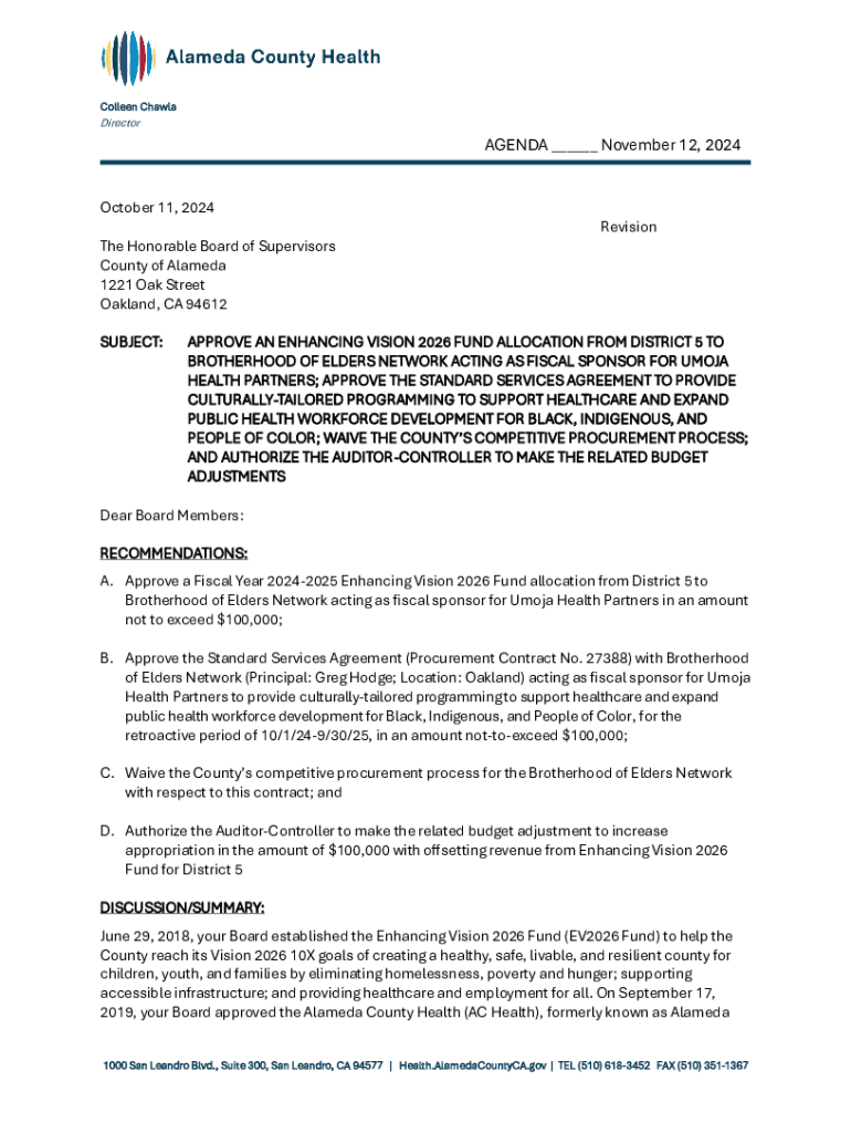 This document outlines the approval for an allocation from the Enhancing Vision 2026 Fund to the Brotherhood of Elders Network, acting as fiscal sponsor for Umoja Health Partners. It addresses the provision of culturally-tailored programming aimed at supporting healthcare and expanding public health workforce development for Black, Indigenous, and People of Color. The recommendations include waiving the competitive procurement process and making budget adjustments to facilitate the funding.