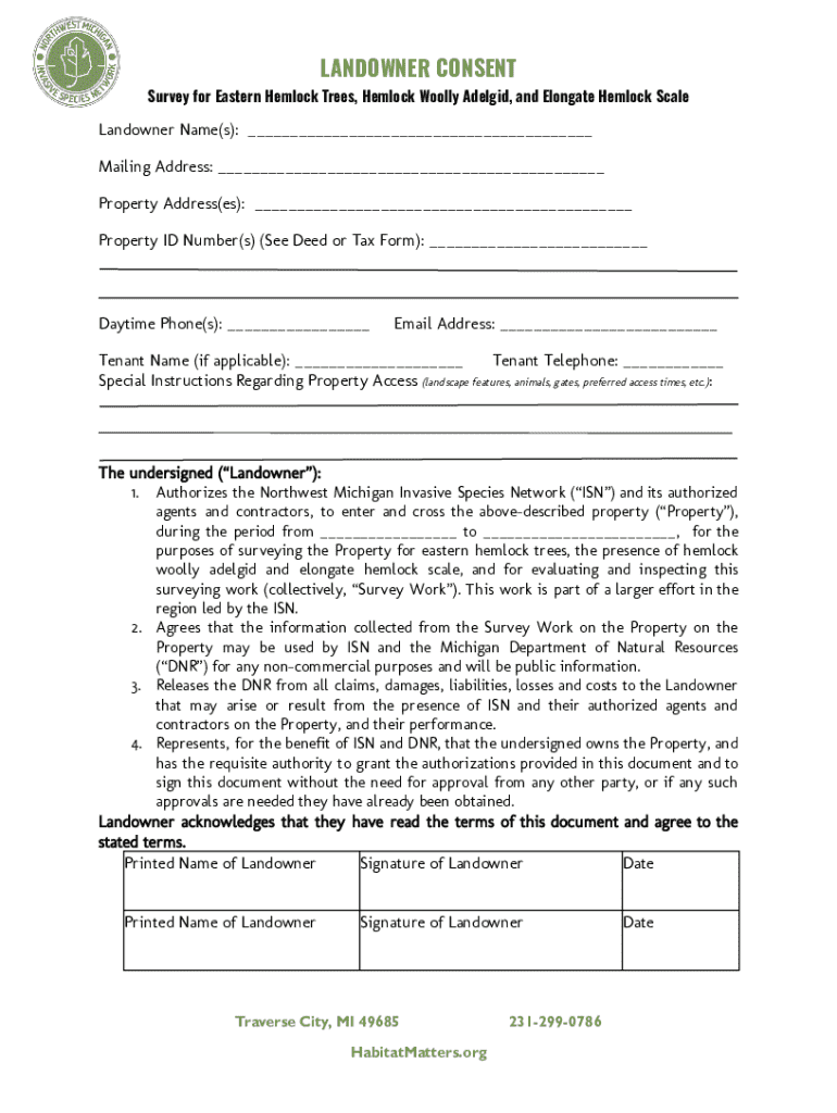 LANDOWNER CONSENT Survey for Eastern Hemlock Trees, Hemlock Woolly Adelgid, and Elongate Hemlock ScaleLandowner Name(s): ___ Mailing Address: ___ Property Address(es): ___ Property ID Number(s) (See