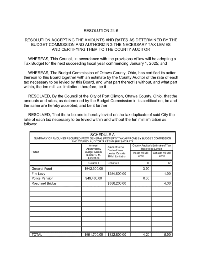 This resolution involves the acceptance of amounts and tax rates determined by the Budget Commission for the fiscal year starting January 1, 2025. It authorizes necessary tax levies to be certified to the County Auditor, detailing the amounts required from general property taxes as approved by the Budget Commission and the estimated tax rates for different funds.