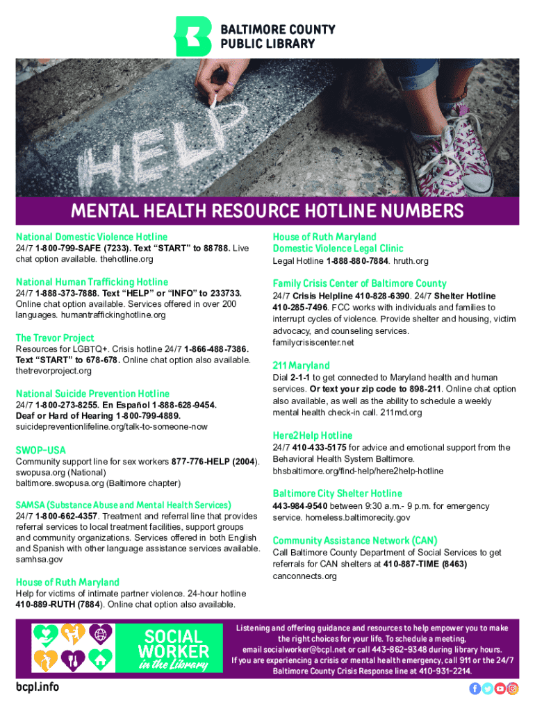 MENTAL HEALTH RESOURCE HOTLINE NUMBERS National Domestic Violence Hotline24/7 1800799SAFE (7233). Text START to 88788. Live chat option available. thehotline.orgNational Human Trafficking Hotline24/7