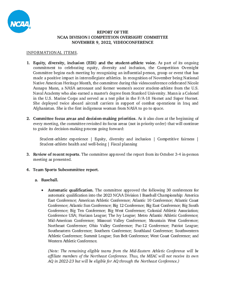 This document summarizes the discussions and decisions made during the NCAA Division I Competition Oversight Committee meeting held via videoconference on November 9, 2022. Key topics include equity, diversity, and inclusion initiatives, committee focus areas, approvals for automatic qualifications in various NCAA championships, and discussions on potential changes in championship formats for different sports.