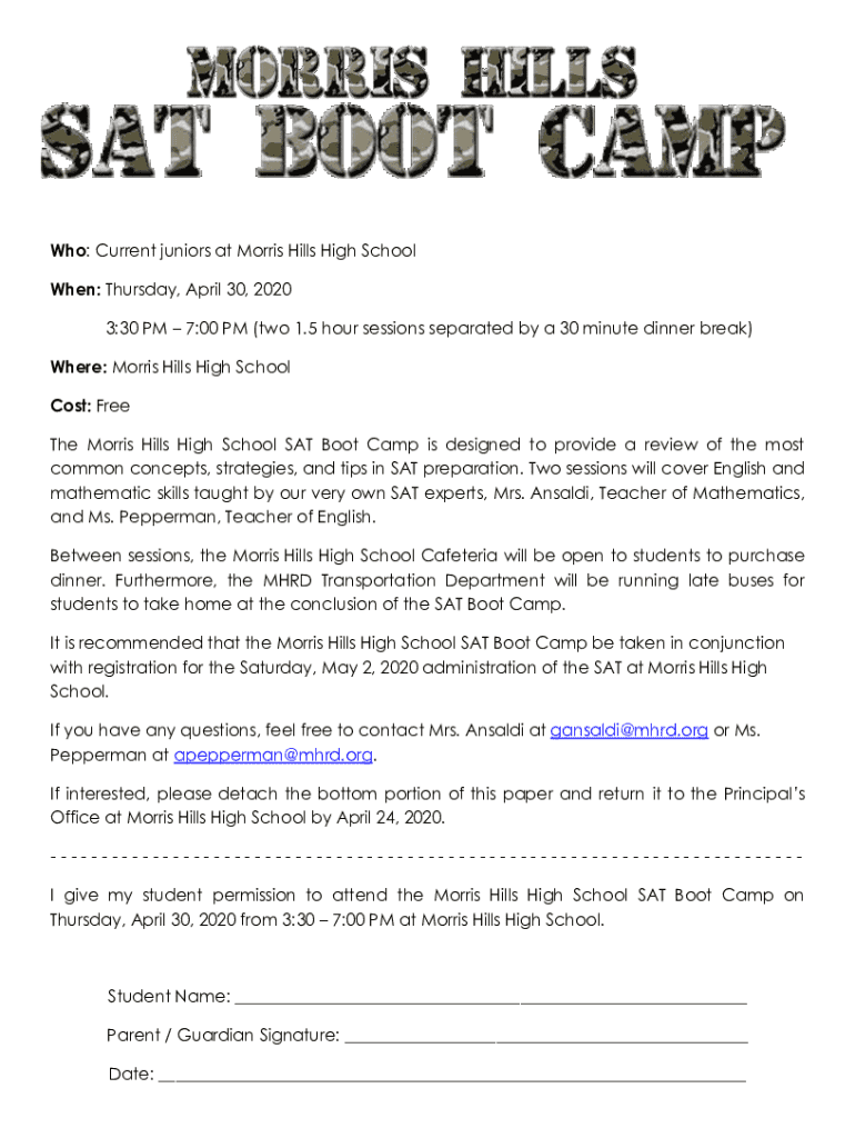 Who: Current juniors at Morris Hills High School When: Thursday, April 30, 2020 3:30 PM 7:00 PM (two 1.5 hour sessions separated by a 30 minute dinner break) Where: Morris Hills High School Cost:
