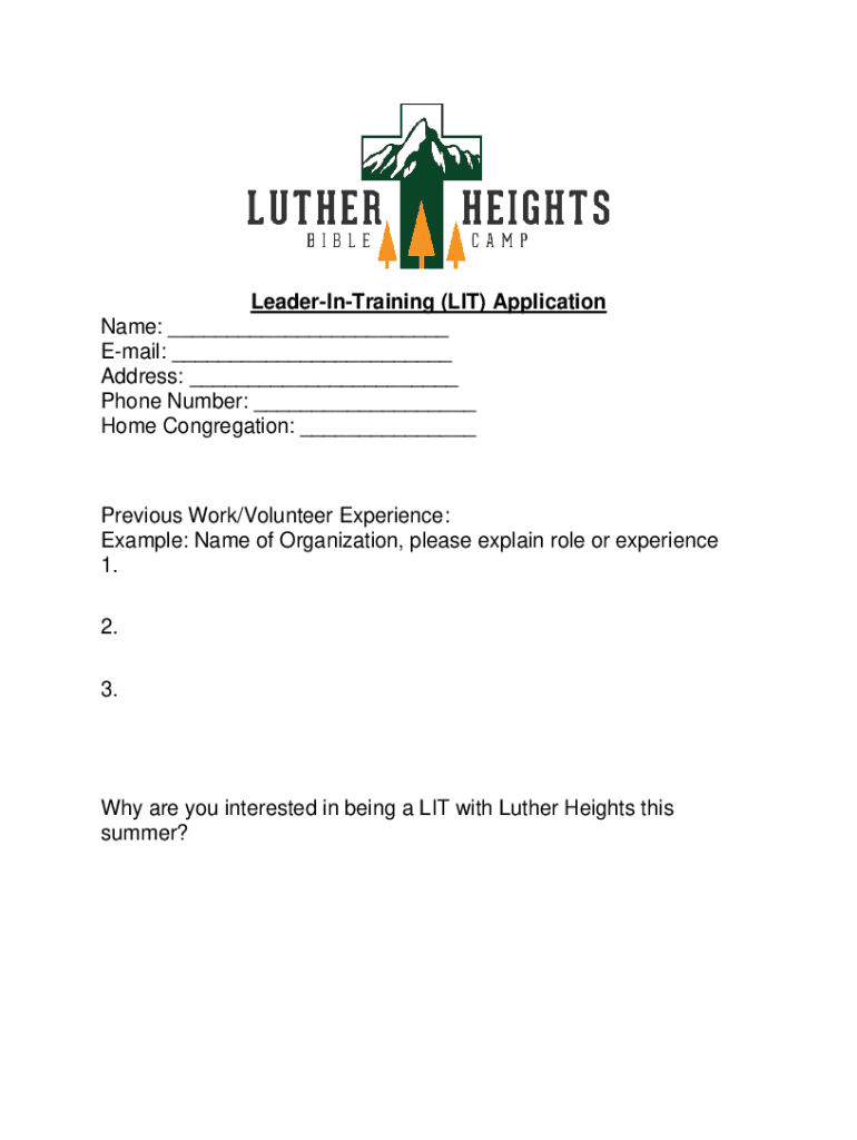 The Leader-In-Training (LIT) Application is designed for individuals interested in participating in the LIT program at Luther Heights. The application gathers personal information, previous experience, interest in the program, and unique contributions the applicant can make. It also includes a section for references and outlines the next steps in the application process.