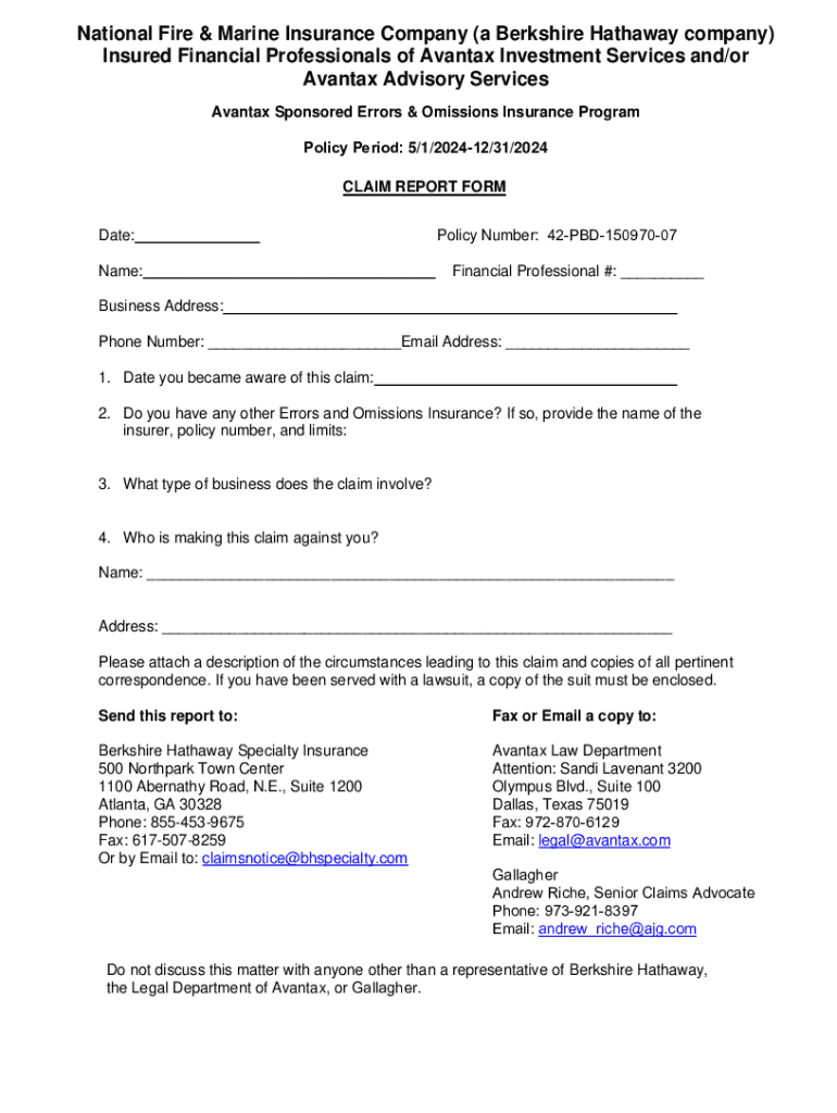 This document is a claim report form intended for financial professionals insured under the Avantax Sponsored Errors & Omissions Insurance Program. It includes sections for reporting details about the claim, including personal information, policy number, claim details, and contact information for relevant parties. The report must be submitted to specific contacts at Berkshire Hathaway and Avantax Law Department.
