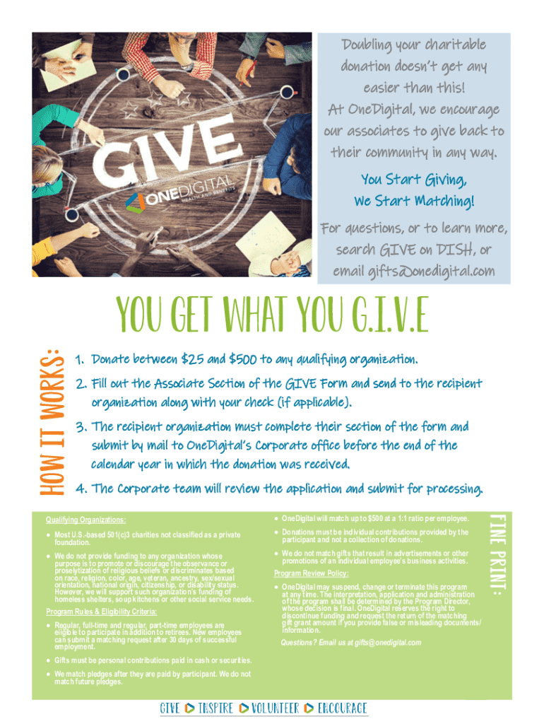Doubling your charitable donation doesnt get any easier than this! At OneDigital, we encourage our associates to give back to their community in any way. You Start Giving, We Start Matching! For questions,