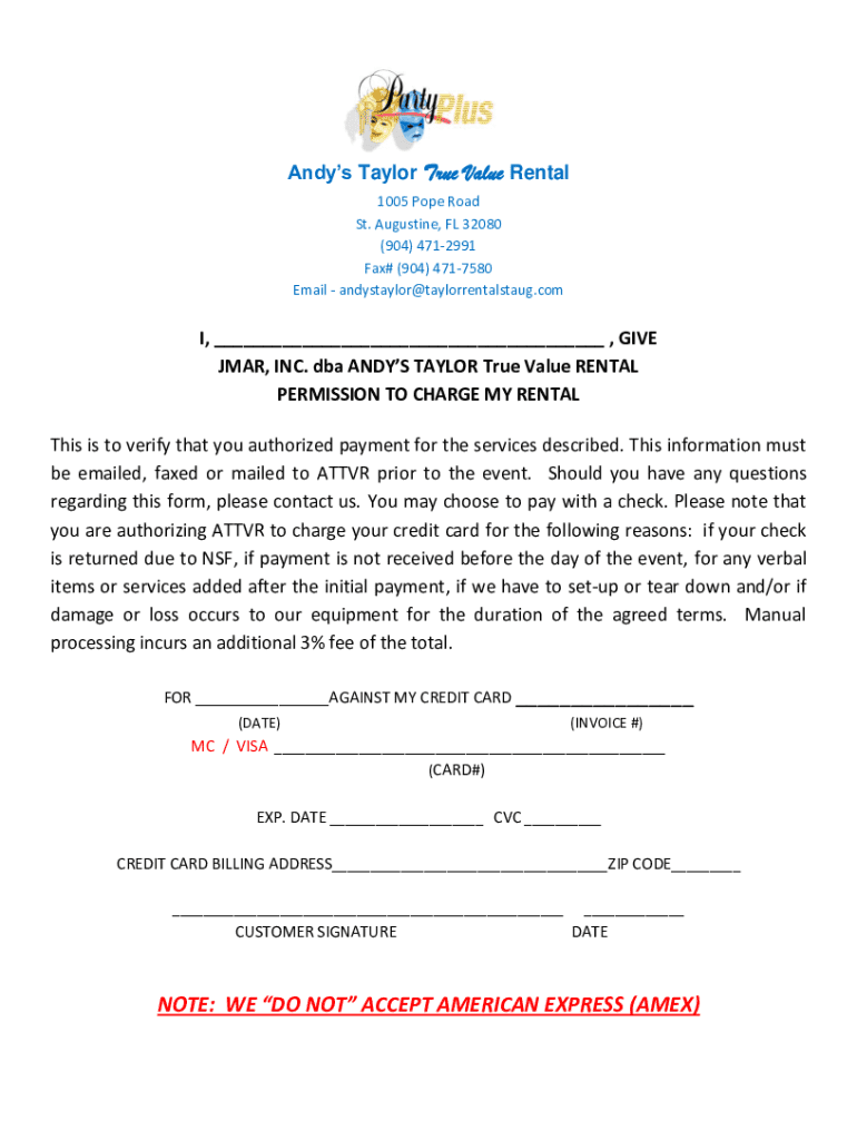 Andys Taylor True Value Rental 1005 Pope Road St. Augustine, FL 32080 (904) 4712991 Fax# (904) 4717580 Email andystaylor@taylorrentalstaug.comI, ___ , GIVE JMAR, INC. dba ANDYS TAYLOR True Value RENTAL