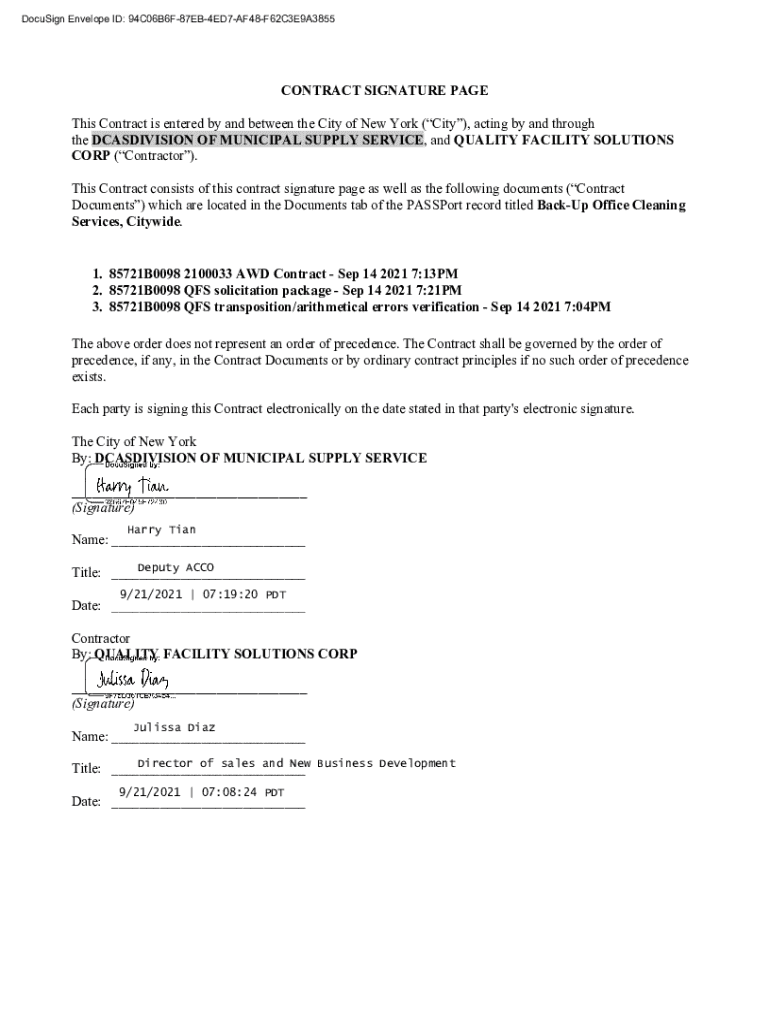 DocuSign Envelope ID: 94C06B6F87EB4ED7AF48F62C3E9A3855CONTRACT SIGNATURE PAGE This Contract is entered by and between the City of New York (City), acting by and through the DCASDIVISION OF MUNICIPAL