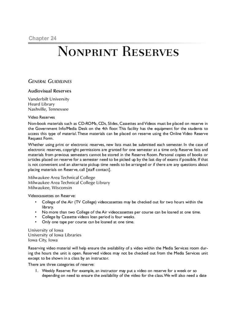 Chapter 24Nonprint Reserves GENERAL GUIDELINES Audiovisual Reserves Vanderbilt University Heard Library Nashville, Tennessee Video Reserves Nonbook materials such as CDROMs, CDs, Slides, Cassettes