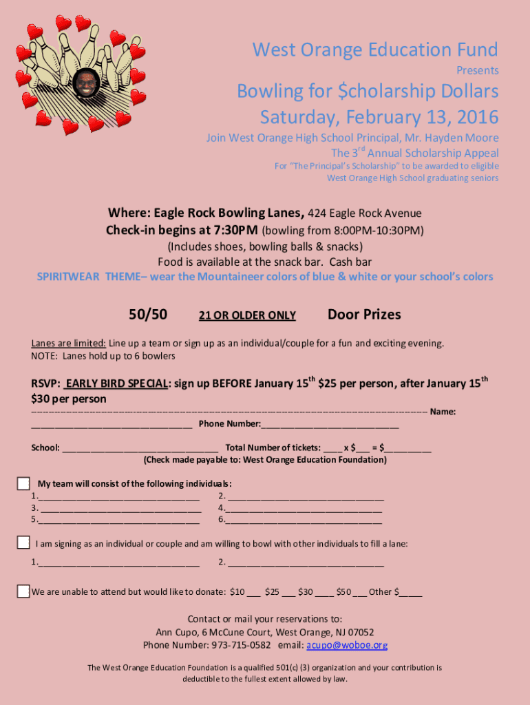 West Orange Education Fund PresentsBowling for $cholarship Dollars Saturday, February 13, 2016 Join West Orange High School Principal, Mr. Hayden Moore The 3rd Annual Scholarship Appeal For The Principals