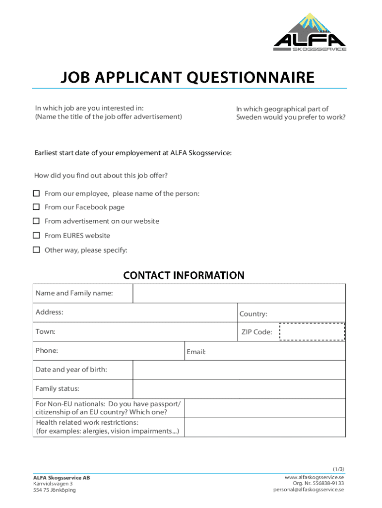 In which job are you interested in: (Name the title of the job offer advertisement)In which geographical part of Sweden would you prefer to work?Earliest start date of your employement at ALFA Skogsservice: