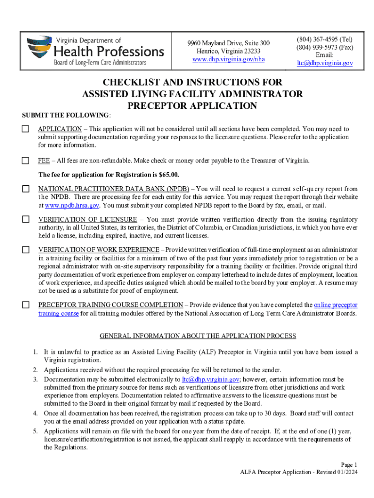This document outlines the application process for becoming a registered Preceptor for Assisted Living Facilities in Virginia. It provides detailed instructions, necessary documentation, and important information regarding fees, licensure verification, work experience verification, and submission methods for the application.
