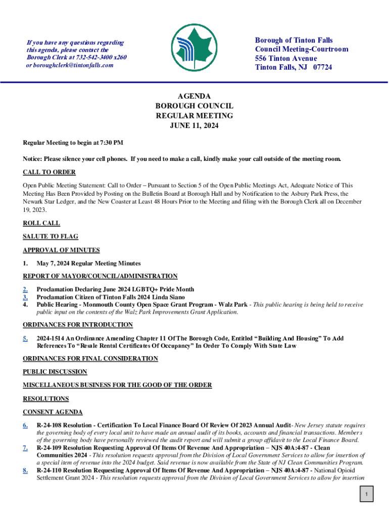 Borough of Tinton Falls Council MeetingCourtroom 556 Tinton Avenue Tinton Falls, NJ 07724If you have any questions regarding this agenda, please contact the Borough Clerk at 7325423400 x260 or boroughclerk@tintonfalls.comAGENDA