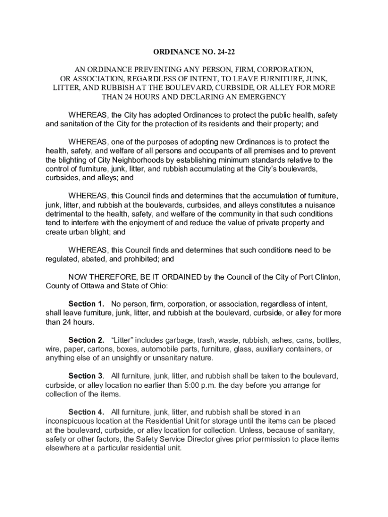 ORDINANCE NO. 2422 AN ORDINANCE PREVENTING ANY PERSON, FIRM, CORPORATION, OR ASSOCIATION, REGARDLESS OF INTENT, TO LEAVE FURNITURE, JUNK, LITTER, AND RUBBISH AT THE BOULEVARD, CURBSIDE, OR ALLEY FOR